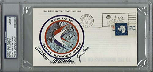 Apollo 15 Crew Signed Insurance Cover Graded MINT 9 PSA/DNA Slabbed Apollo 15 insurance cover, 6.5 x 3.5, with a cachet of the Apollo 15 mission insignia, and bearing a July 26, 1971, Kennedy Space Center postmark, signed in black felt tip by Dave Scott, Al Worden, and Jim Irwin graded MINT 9 by PSA/DNA. Authenticated, graded & encapsulated by PSA/DNA.Autographs-For-Sale strives for the unique items that are hard to obtain!